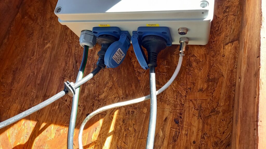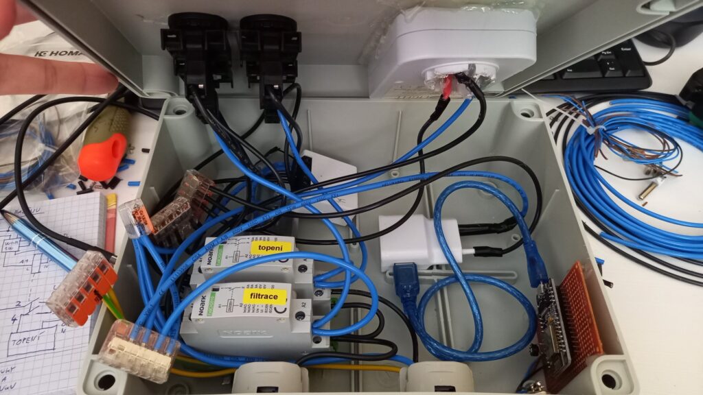 Uvnitř rozvaděče je upravený mechanický časovač na časování spouštění filtrace; wi-fi spínač Sonoff mini, pro možnost vzdáleného spínání topení a wi-fi teploměr na měření teploty vody a vzduchu.