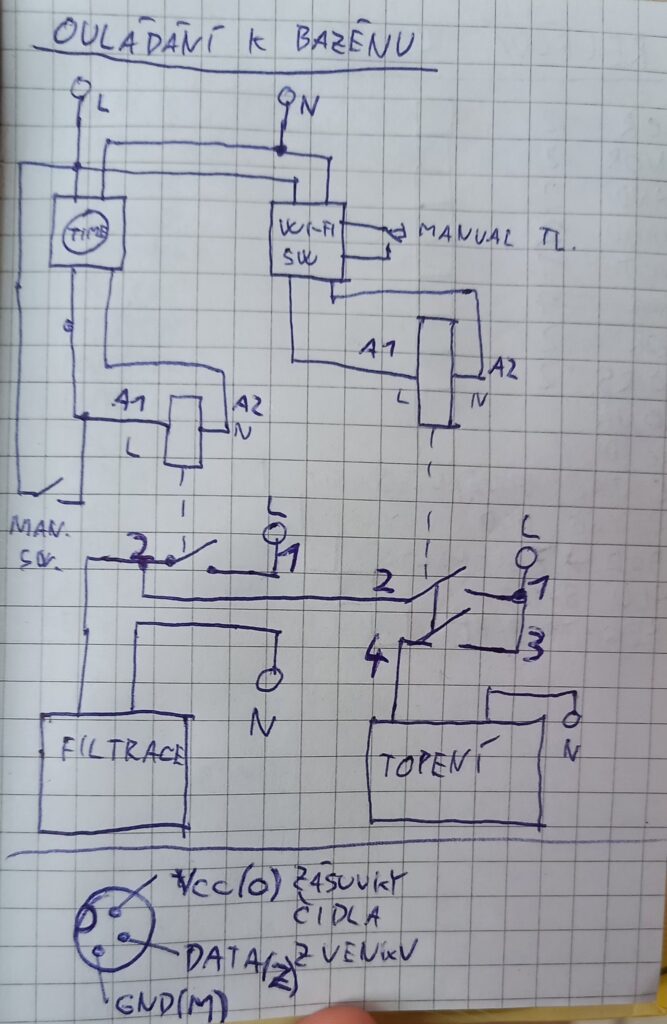 Pro letošní koupací sezónu (2023) jsme se rozhodli nahradit solární ohřev bazénu tepelným čerpadlem. Na mě bylo vytvořit ovládání které bude spínat filtraci v nastavených intervalech, umožňovat sepnout topení a měřit teplotu vody a vzduchu.
