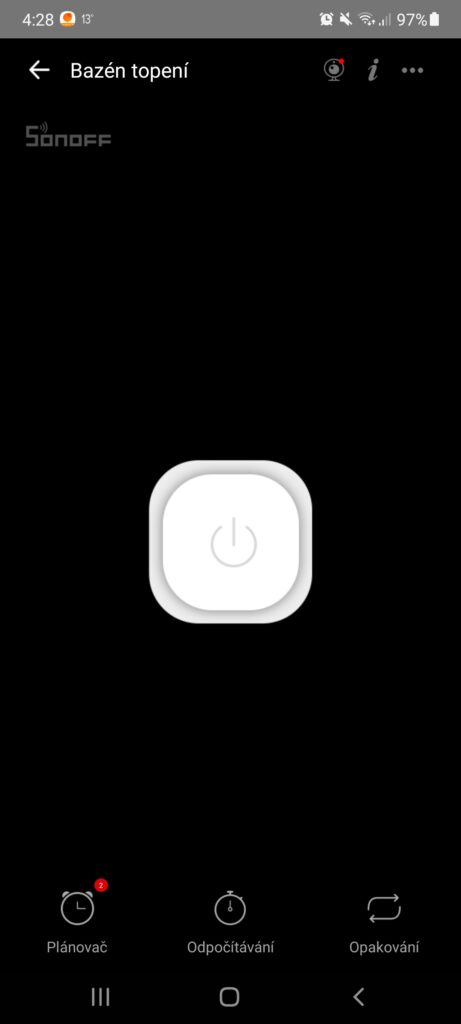 Topení je, díky spínači Sonoff, možné ovládat z mobilní aplikace přes internet. V aplikaci je také možnost nastavení časovače a plánování spouštění.