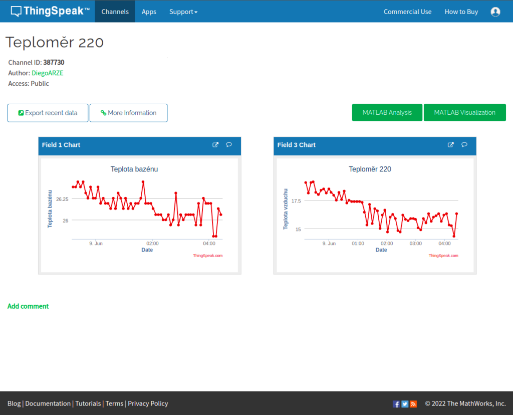 Teploty z čidel jsou dostupné na webu Thingspeak. Existuje i widget na plochu do mobilu