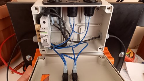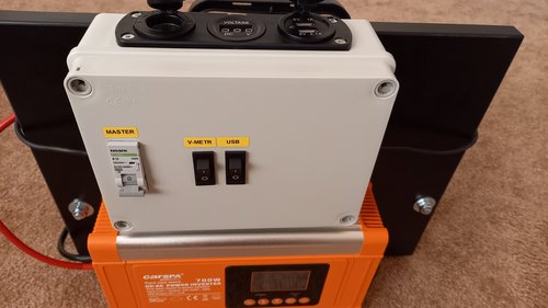 Jako zásobník energie je použit trakční akumulátor s kapacitou 100Ah (zhruba 1.2kWh). K němu je připojen měnič na AC 230V s výkonem 700W a čistým sinusem, dále rozvaděč s autozásuvkou na 12V, DC měničem na 5V USB a voltmetrem pro kontrolu napětí akumulátoru. USB a V-metr mají každý vlastní vypínač a společně s autozásuvkou jsou spínány a jištěny 10A jističem.