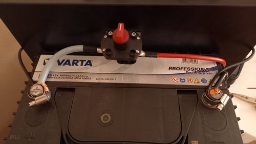 Měnič na AC 230V není připojen na přímo (má malý odběr i ve vypnutém stavu) ale připojuje se pomocí odpojovače na kladný pól akumulátoru (záporný pól je natvrdo).