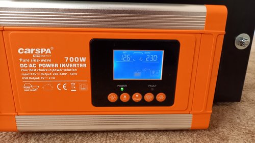 DC/AC měnič umí zobrazit stav akumulátoru, napětí, proud a frekvenci na výstupu a zatížení na výstupu. Má i běžné ochrany proti zkratu, přetížení, hlubokému vybití akumulátoru, atp.