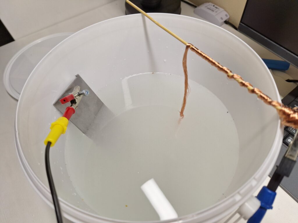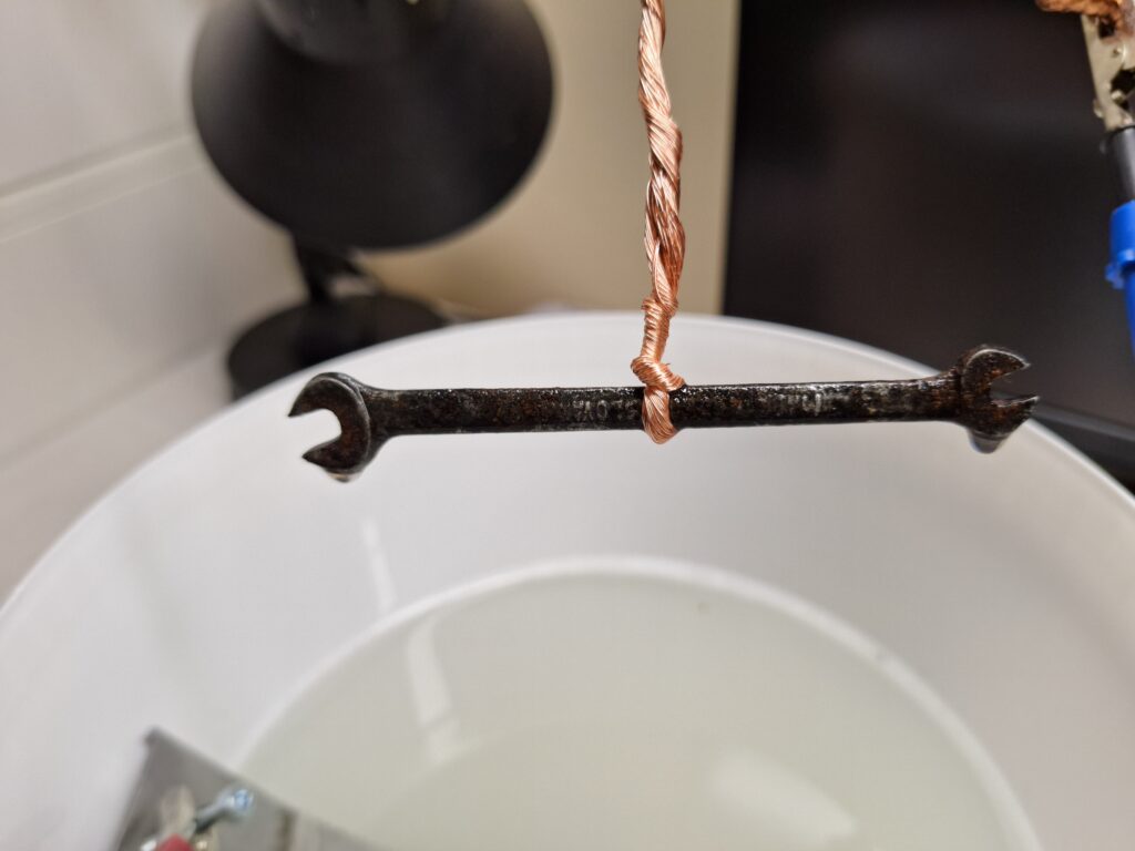 Po zapnutí zdroje začne na povrchu předmětu vznikat vodík (jemné bublinky) a rez se postupně uvolňuje.