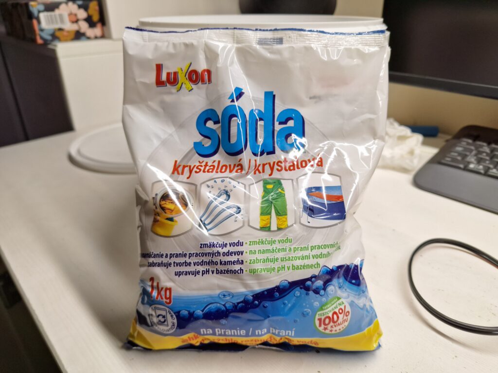 - Do plastové nádoby se připraví roztok vody a prací sody