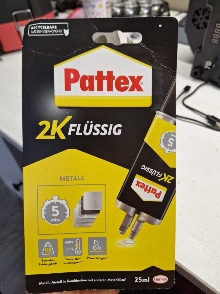 Použil jsem lepidlo Pattex 2K Flüssig, což je dvousložková pryskyřice vhodná pro pevné a konstrukční spoje.