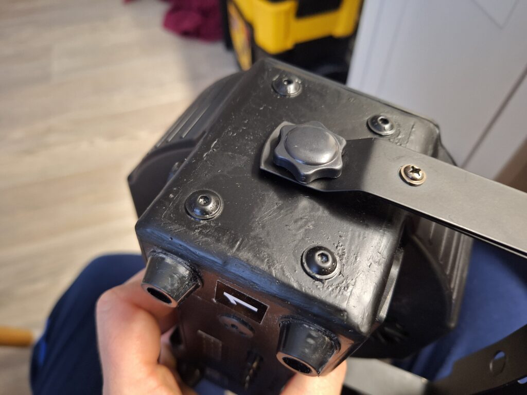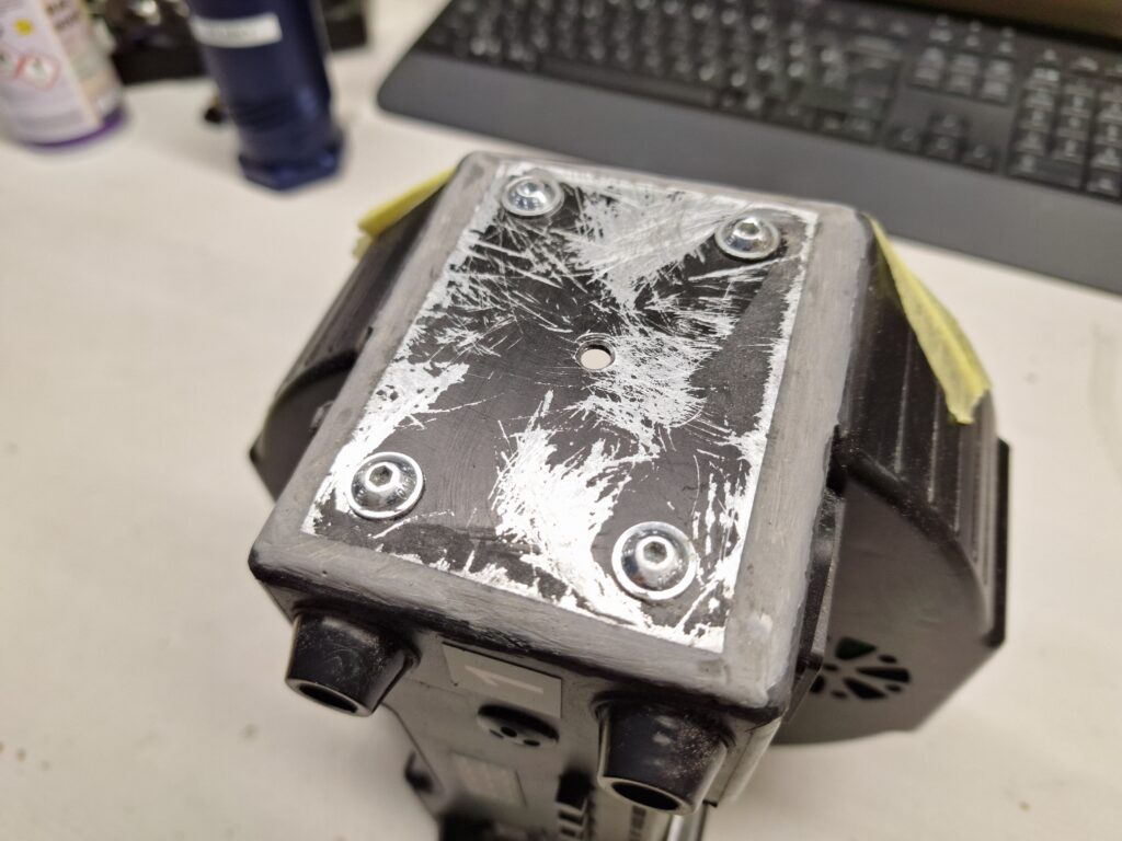 Začal jsem demontáží závěsu, LED modulů a krycího panelu, abych se dostal dovnitř těla světlometu. Poté jsem srovnal popraskané části a odstranil všechny uvolněné a nedržící úlomky. Z kusu plechu jsem následně vyrobil výztužnou záplatu – uprostřed jsem vyřízl závit pro uchycení závěsu a v rozích navrtal otvory pro její přišroubování.
