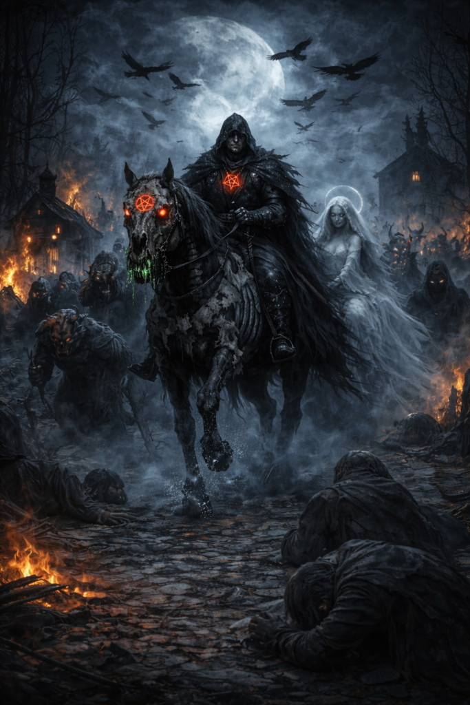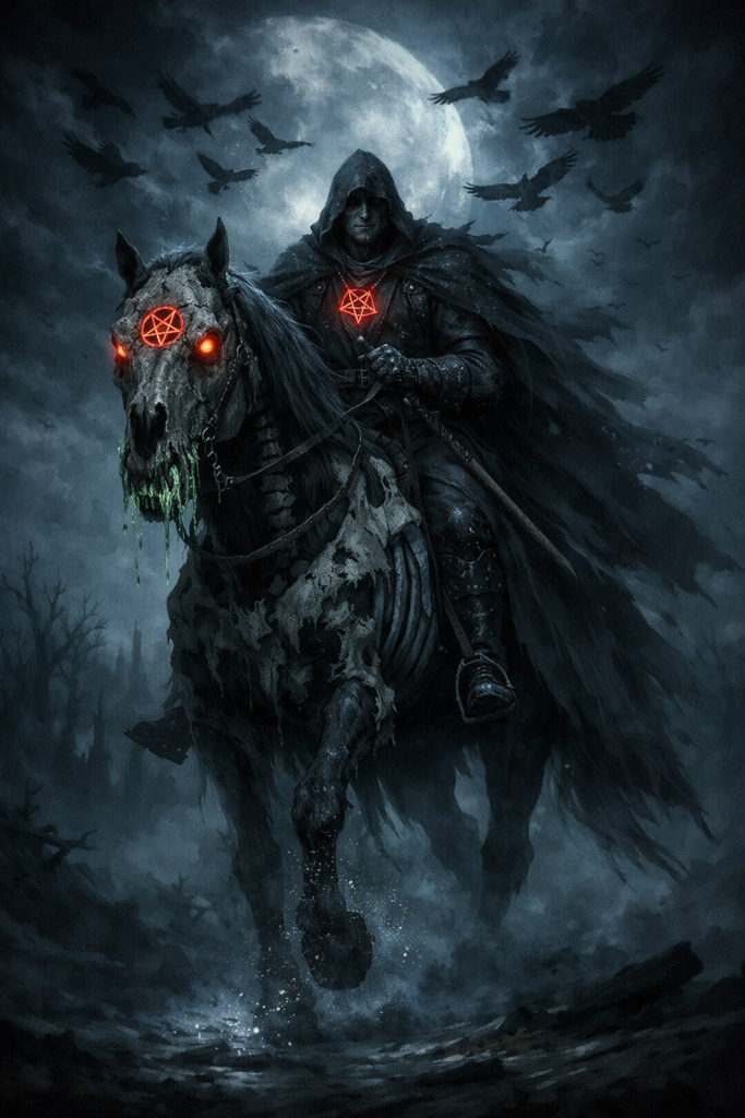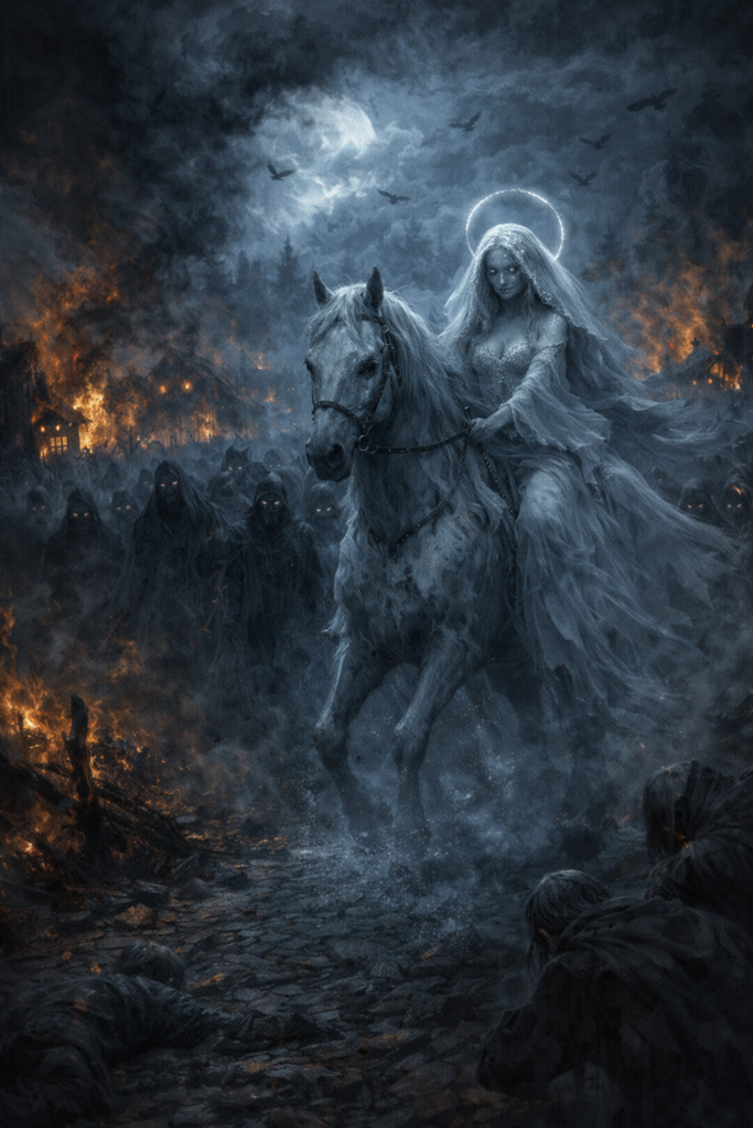 Paní Pýcha na svém oři, za ní hordy přízraků. Jedou drancovat a bořit, dým se vpíjí do mraků. Vědí o nás, jak jsme malí, jak se rádi prodáváme. Dál se temné voje valí kosit neznámé i známé.