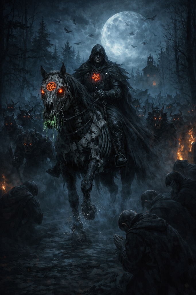 V čele jede temný pán v sedle kostlivýho hřebce. Nad ním krouží hejno vran, signum pekla září v lebce. Hvězdný prach má na botách, kape žíravina z tlamy. Je to král, má jméno Strach. Shání půdu pro své chrámy.