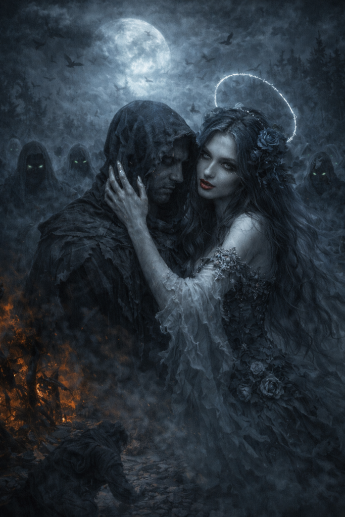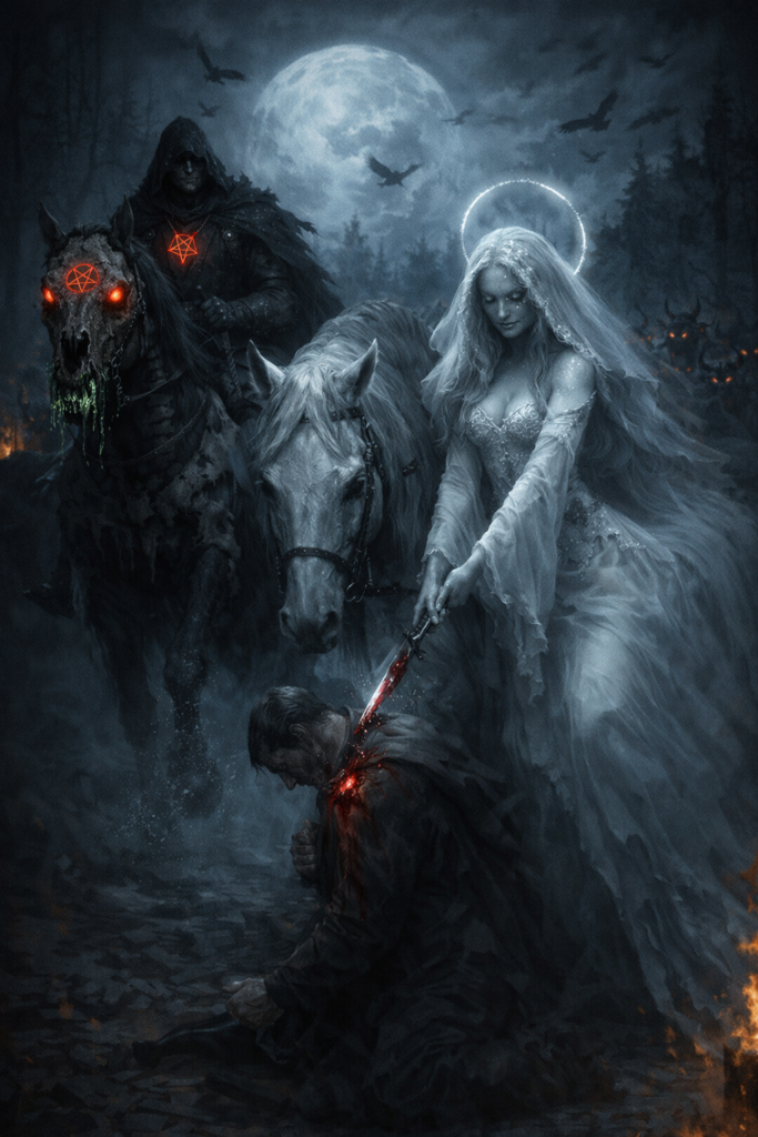 Vedle cválá jeho paní Madam Pýcha v bílé róbě. Drtí duši jemnou dlaní, aby živá tlela v hrobě. Bledý přízrak s krásnou tváří v bílých šatech skrývá dýku. Pod domnělou svatozáří bodá dýkou do hrudníku.