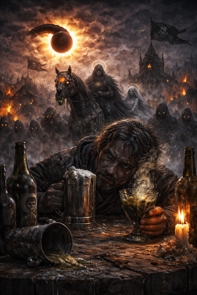Slunce spolkne had a s ním vše, co jsi míval rád. Vlajky kostlivý budou na všech věžích vlát. Pij na zdraví, příteli! Jen chlastej! Máme v číších prudký jed. Pak můžeš vymýšlet a napravovat svět. Ožer se na plech, abys už nikdy nechtěl křídla…
